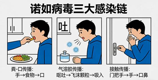诺如病毒主要通过以下途径传播,校园环境为其提供了“理想”的传播条件: